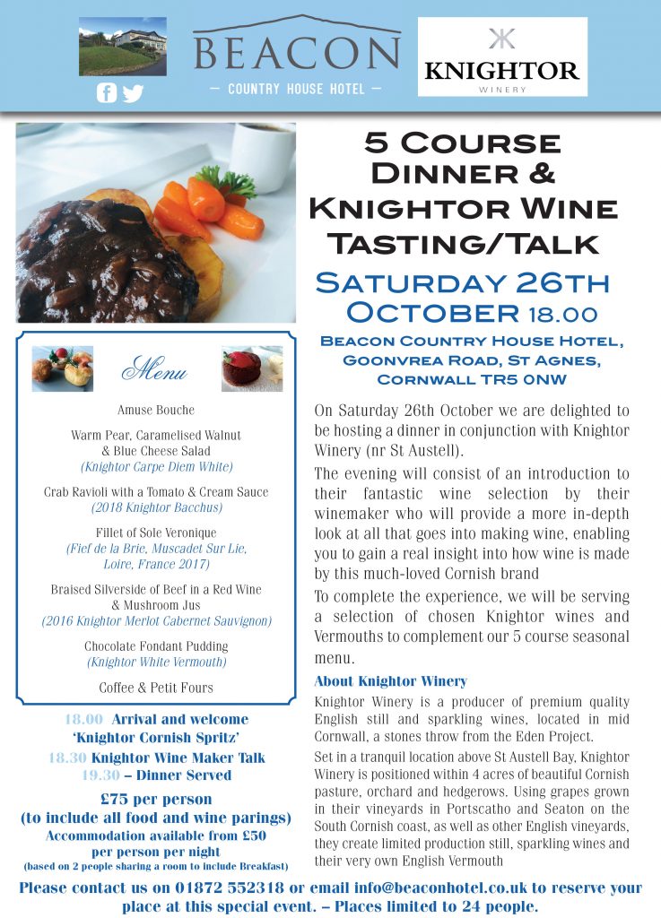 On Saturday 26th October, we are delighted to be hosting a dinner in conjunction with Knightor Winery (near St Austell).