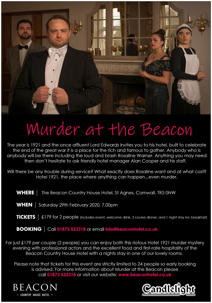 Please note that tickets for this event are strictly limited to ensure the personal touch so early booking is advised. For more information about Murder at the Beacon please call 01872 552318 or email us at info@beaconhotel.co.uk
